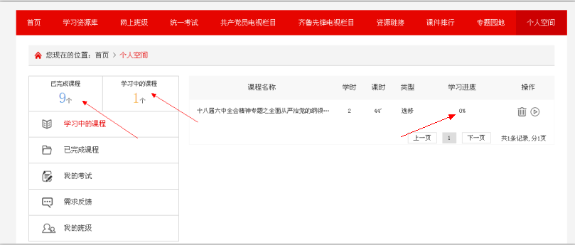 4、点击右上角“个人空间”,可以查看学习中的课程和已完成课程。 普通党员每年不少于40学时,区党工委书记及班子成员、各基层党(工)委书记及班子成员、各党总支部书记及总支部班子成员、各党支部书记及支部委员每年不少于60学时。