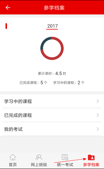 3、点击右下角的“参学档案”,可以看到累计课时、已完成课程和学习中的课程。
